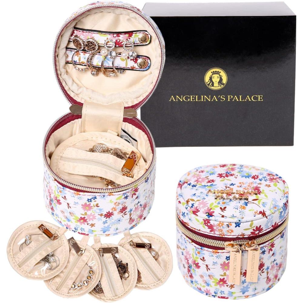 STYLISH & TIDY — This case is designed with double metal zippers and pullers with “Angelina's Palace” logo engraved. The top compartment has 2 stays/bars which can hold 2 pairs of ear rings and 6-9 rings. The main compartment has 4 zippered double-sided transparent pouches which hold 8 necklaces and bracelets, while there is still plenty of space for watches and other accessories.