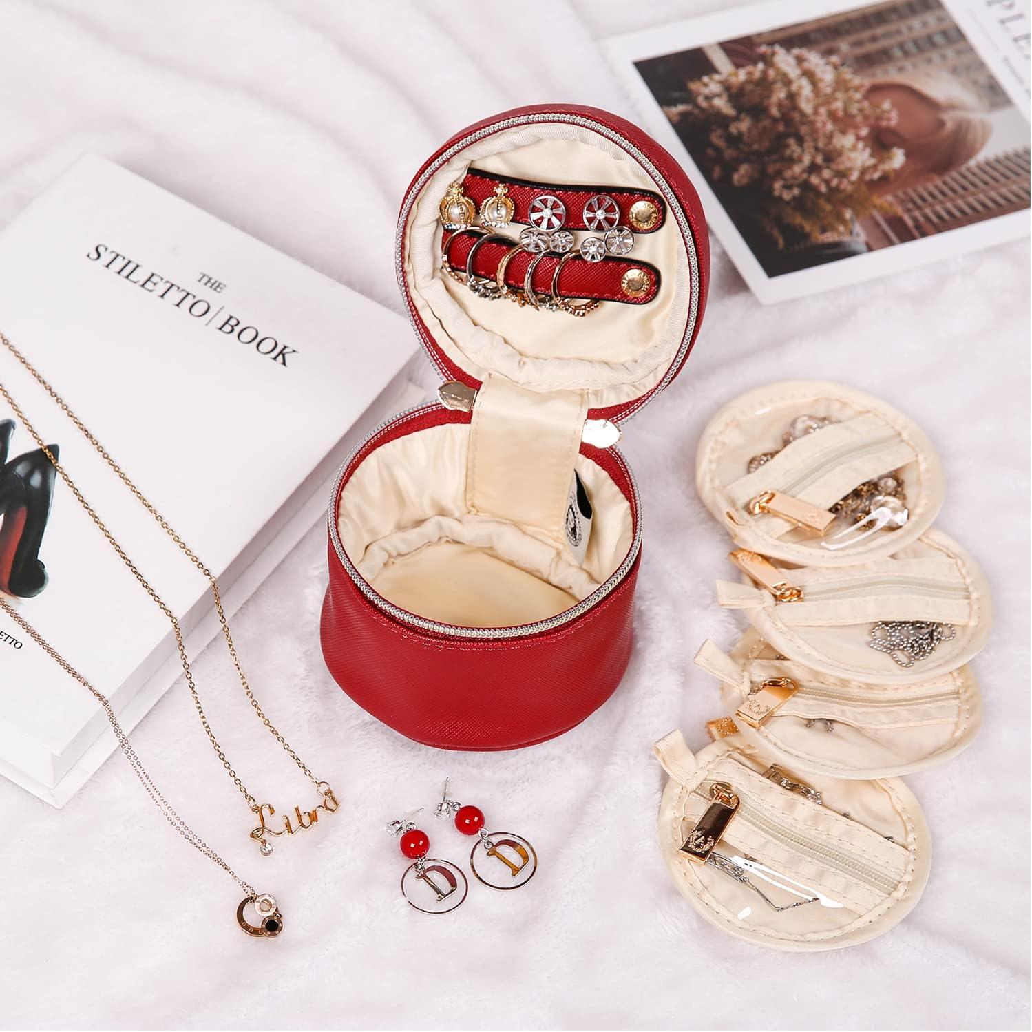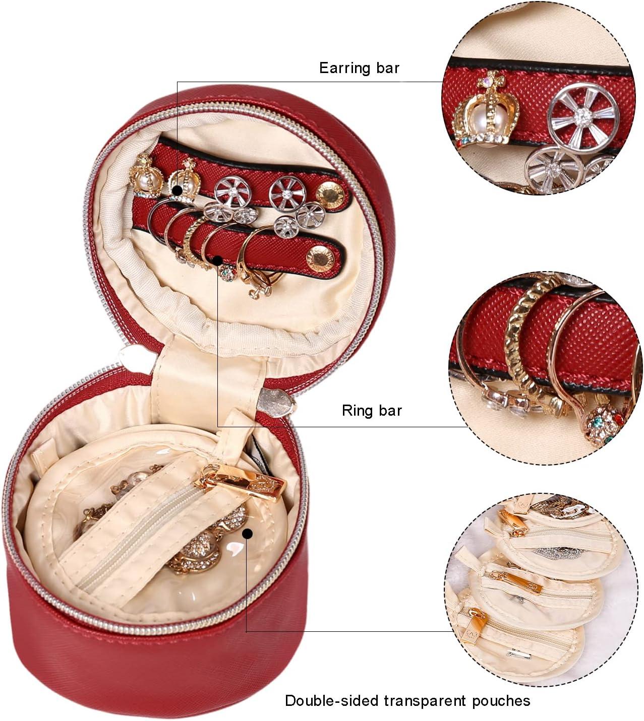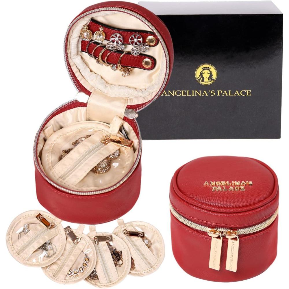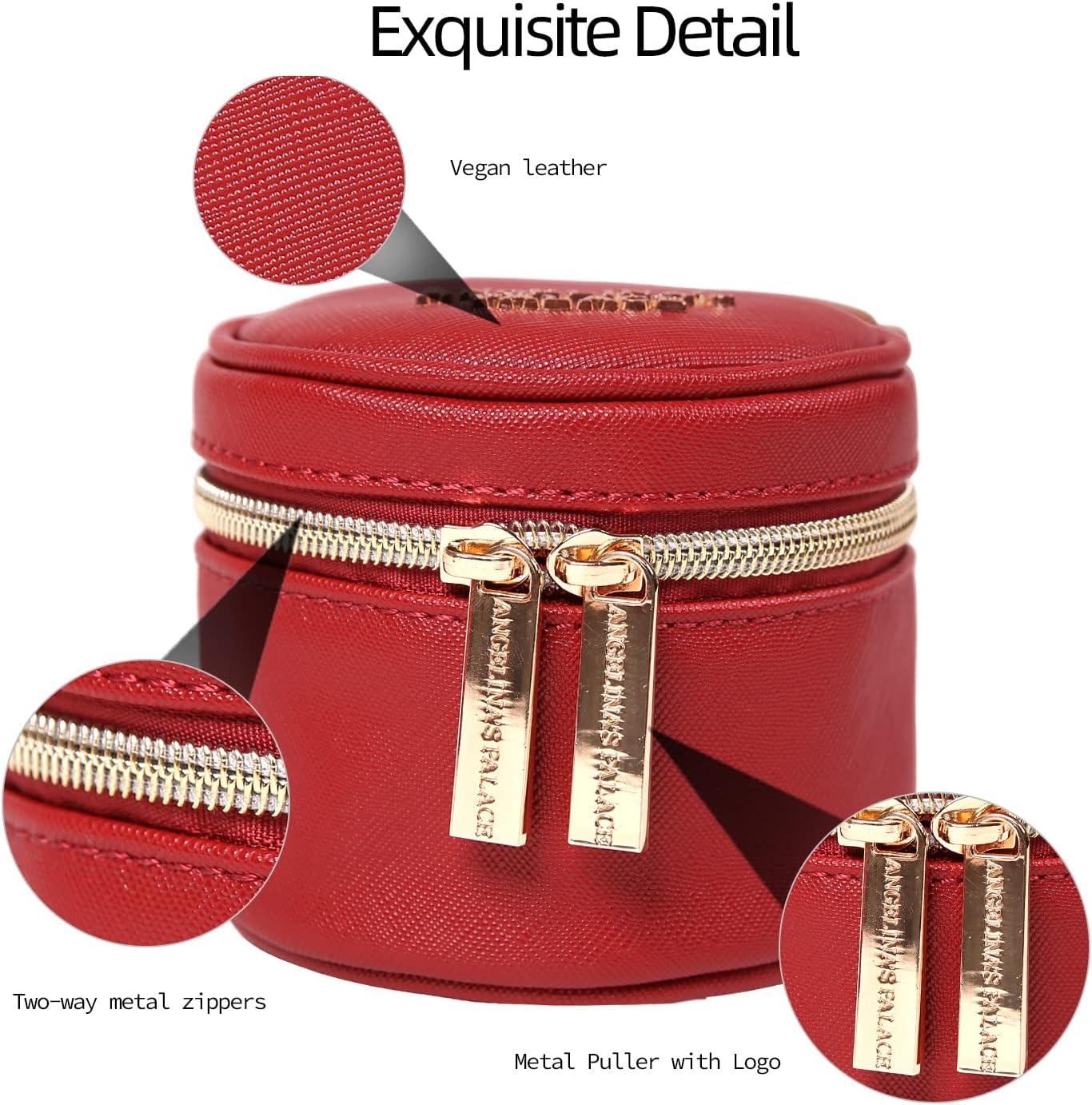 STYLISH & TIDY — This case is designed with double metal zippers and pullers with “Angelina's Palace” logo engraved. The top compartment has 2 stays/bars which can hold 2 pairs of ear rings and 6-9 rings. The main compartment has 4 zippered double-sided transparent pouches which hold 8 necklaces and bracelets, while there is still plenty of space for watches and other accessories.