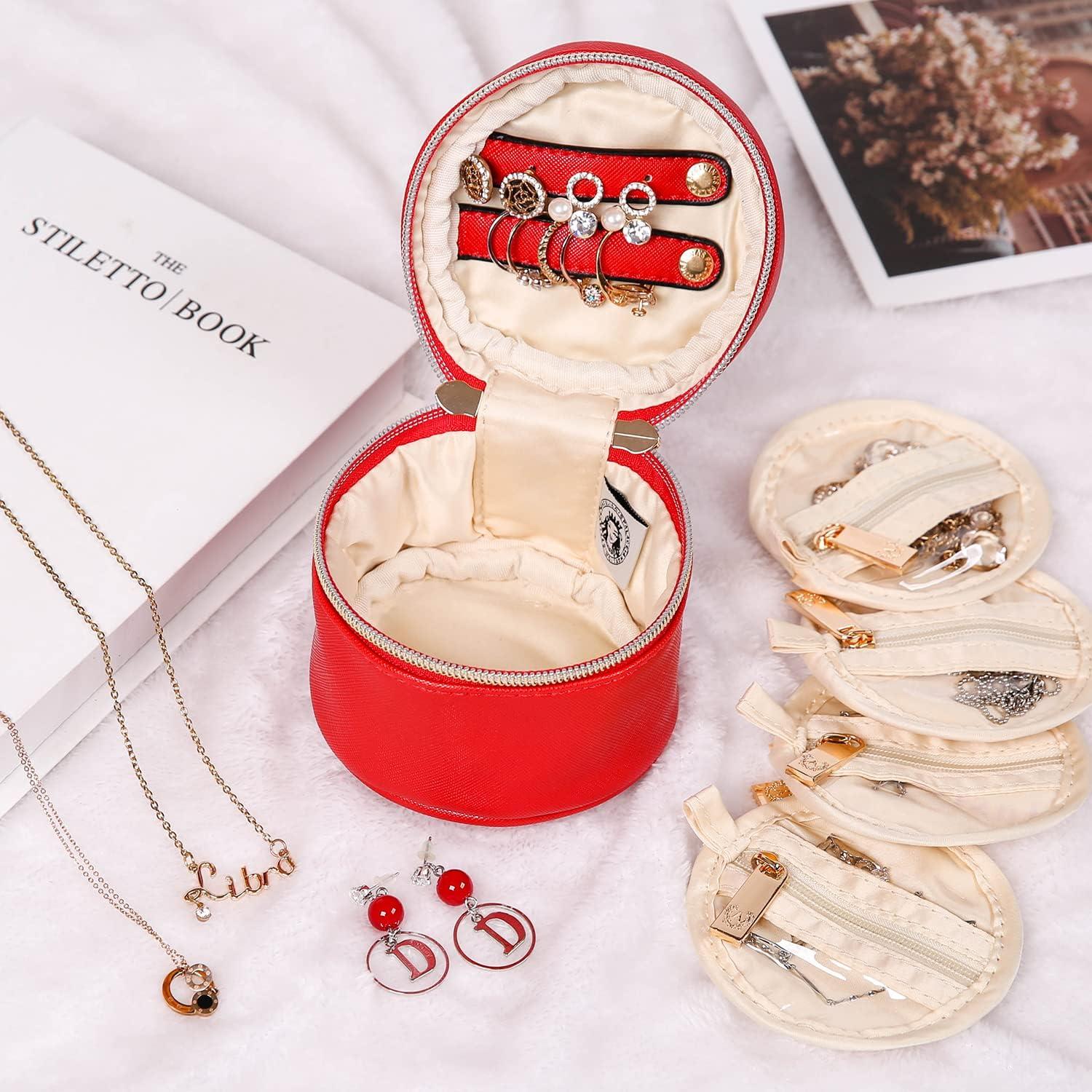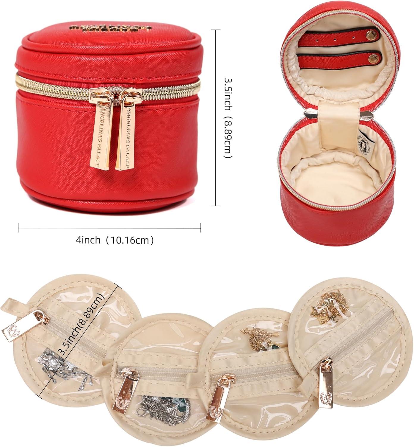 Angelina’s Palace Round Jewelry Organizer Case Travel Bag Bridesmaid Gifts Vegan Leather Box for Necklace Earring Bracelet Ring(soft pink)(Light red)