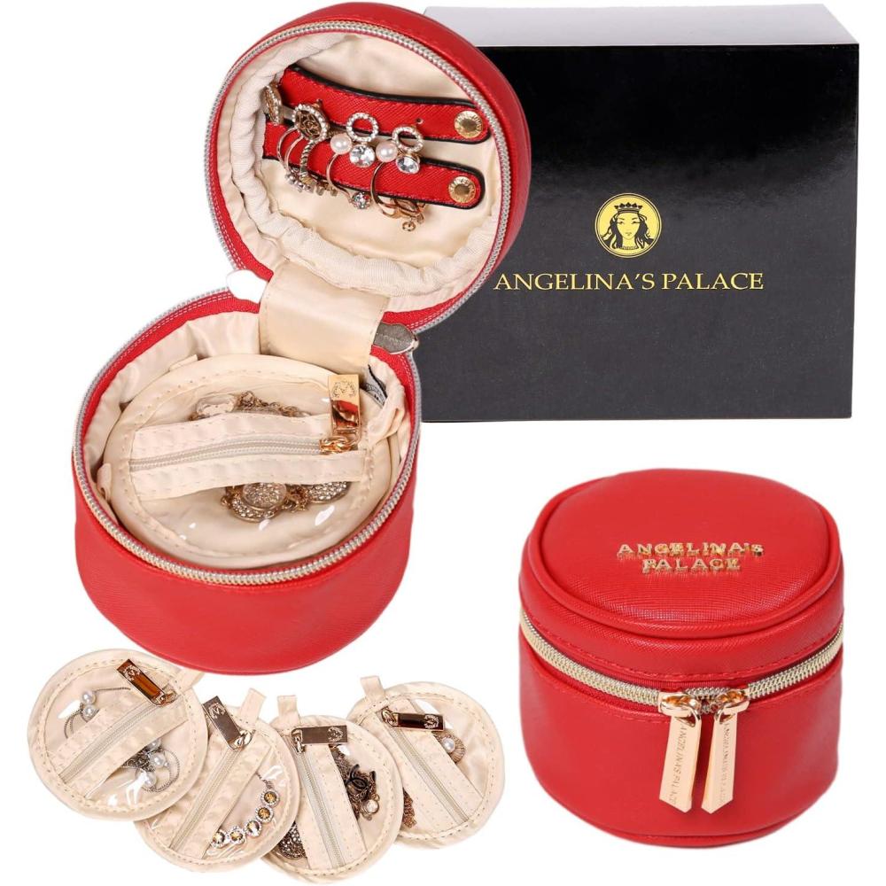 STYLISH & TIDY — This case is designed with double metal zippers and pullers with “Angelina's Palace” logo engraved. The top compartment has 2 stays/bars which can hold 2 pairs of ear rings and 6-9 rings. The main compartment has 4 zippered double-sided transparent pouches which hold 8 necklaces and bracelets, while there is still plenty of space for watches and other accessories.