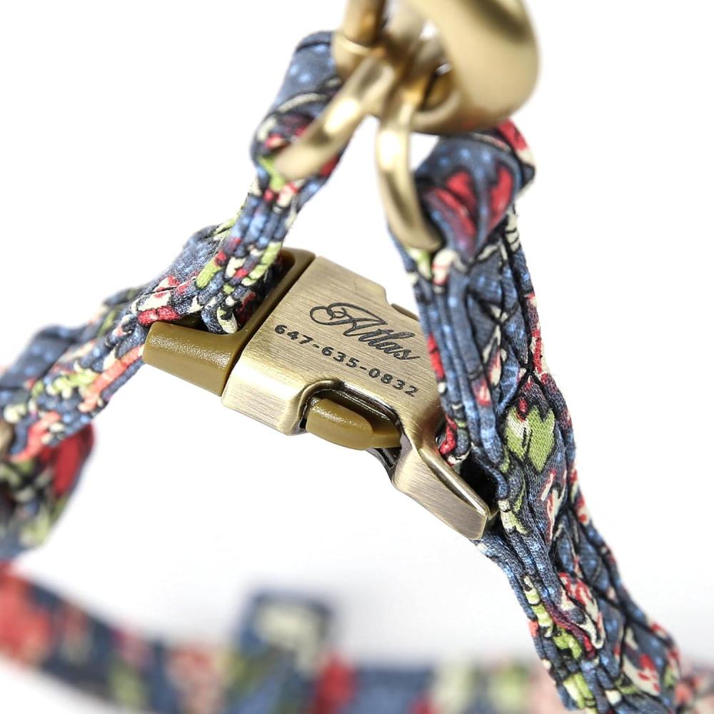 Customizable engraving: Personalize your dog's harness with engraved details on the brass buckle, be it their name, your contact information, or any text of your choice, ensuring they're always identifiable and safe.