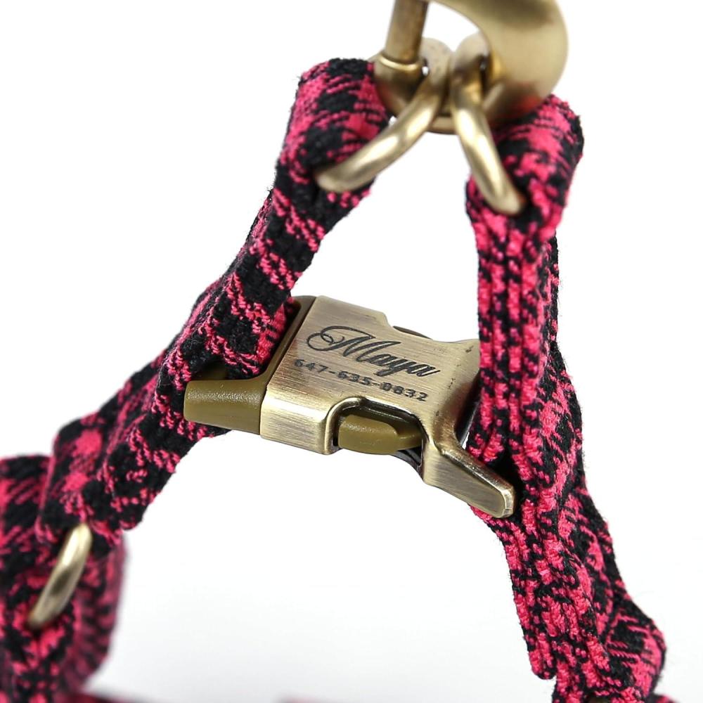 Customizable engraving: Personalize your dog's harness with engraved details on the brass buckle, be it their name, your contact information, or any text of your choice, ensuring they're always identifiable and safe.